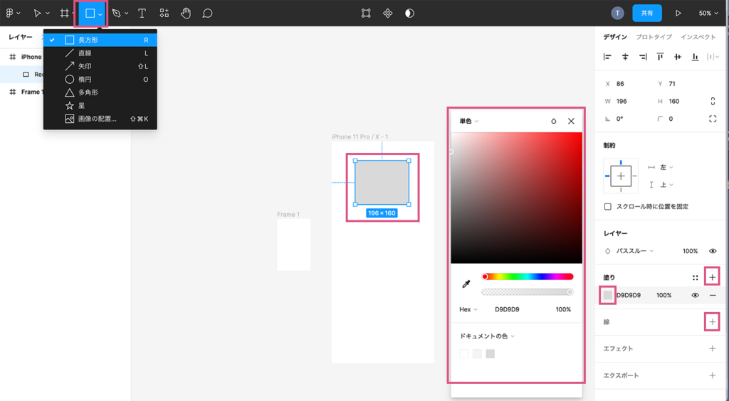 四角形(ショートカット R):ドラッグ&ドロップで描いたら、右のパネルでさまざまな設定ができるので試してみてください。塗りや線、エフェクトなどができます。