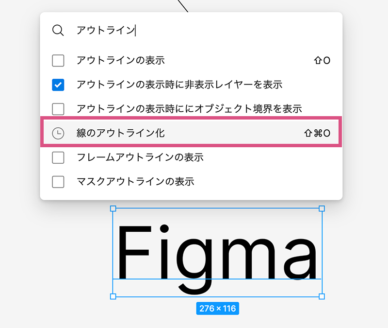 テキストを選択した状態で、コマンドスラッシュで検索窓を出し、「アウトライン」で検索。「線のアウトライン化」を選択。(コマンドシフトOでも同じことができます)