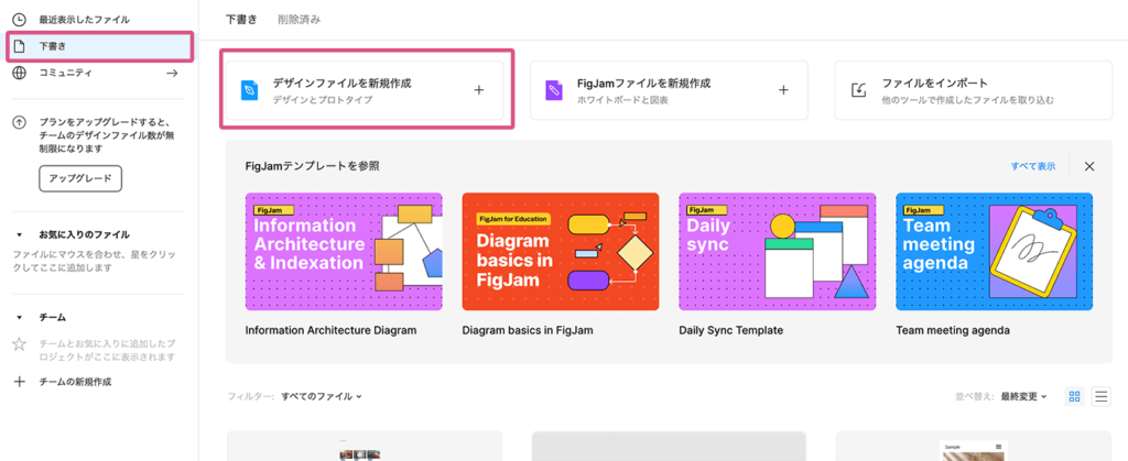 左のパネル「下書き」を選択してから→「デザインファイルを新規作成」で新規ファイルが開かれます。(sketchと比べると簡単に始められます)