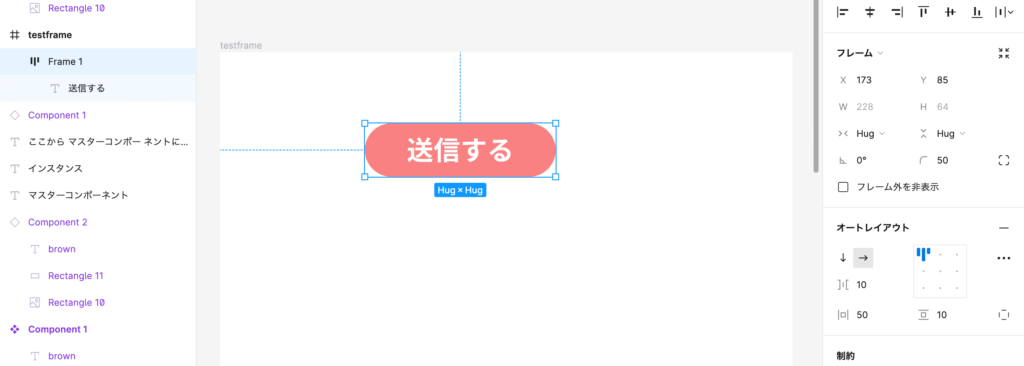 ボタンと文字を選択した状態で、右のパネルの「オートレイアウト」の+ボタンをクリック。