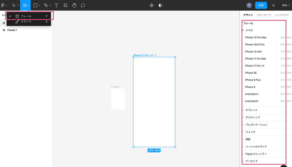 フレームボタンクリックして画面上にドラッグアンドドロップで好みのサイズのフレームが作れる。(Frame 1)