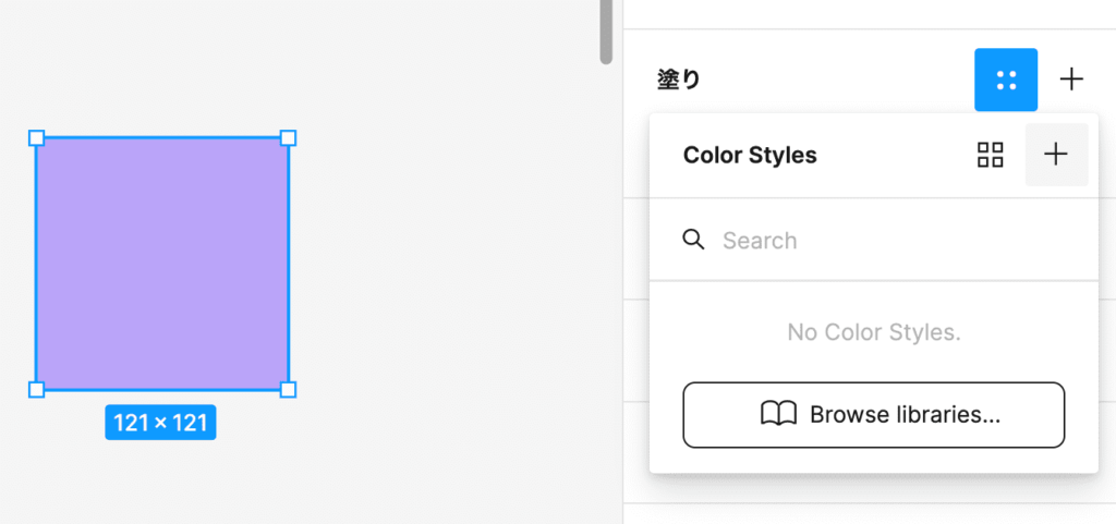 オブジェクトの「塗り」の右のボタンをクリックして「Color Styles」パネルの+ボタンをクリック。