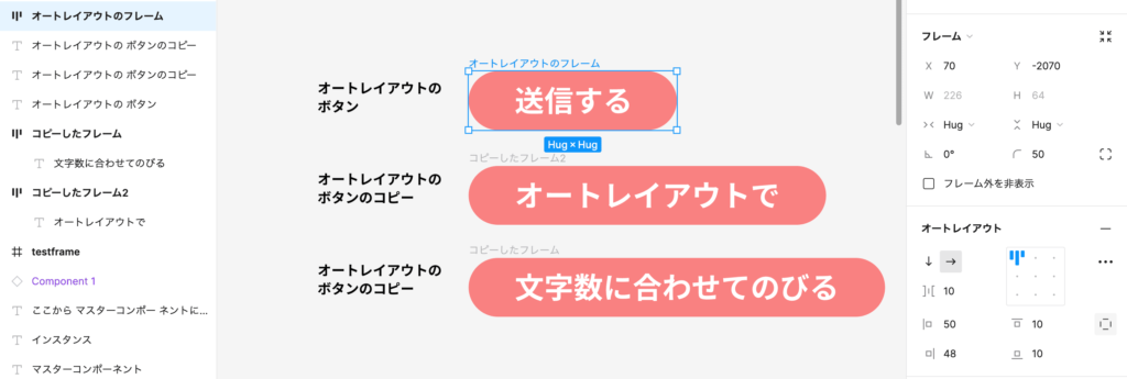 ボタンにオートレイアウトを設定すれば、文字数にあわせて自動でボタンが伸びて、手動で修正しなくて良いので、かなり時短になります。