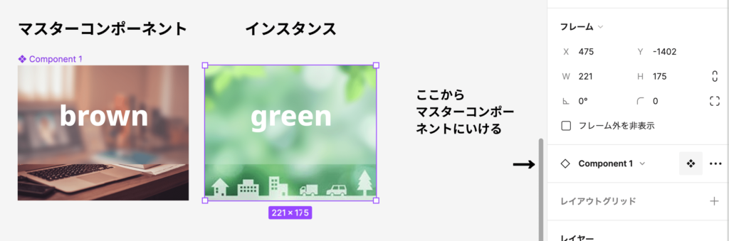 インスタンスは、マスターコンポーネントをコピーしたもの。文字を変更したり、画像を変えたりできる。
