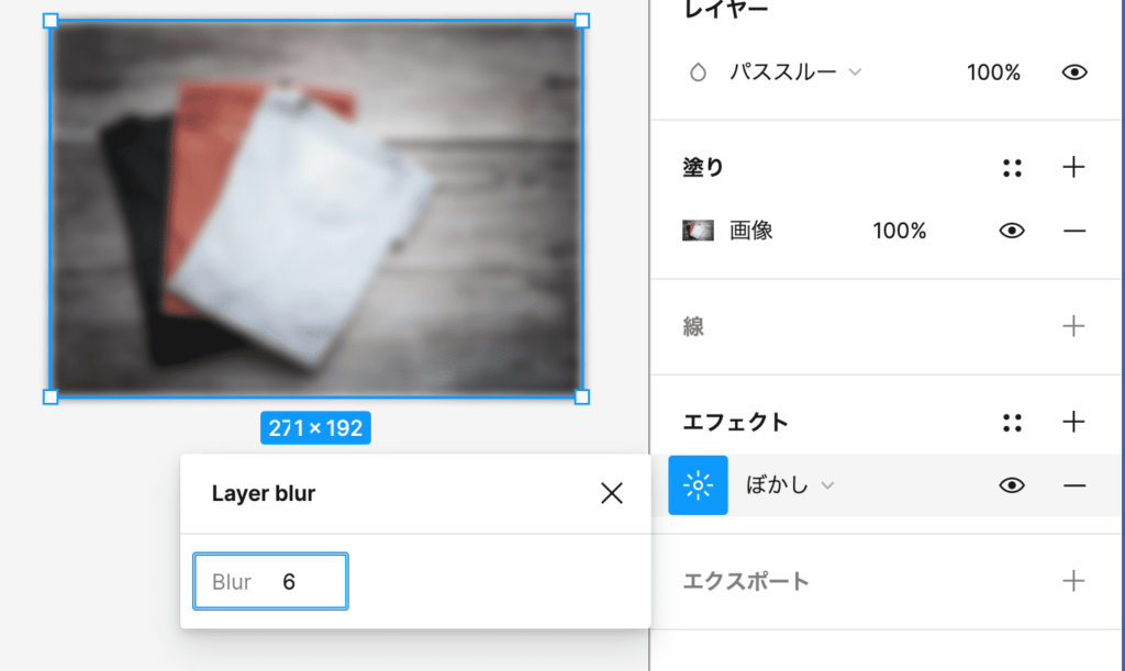 エフェクトの+ボタンをクリックして、ドロップダウンから「ぼかし」を選択。左の設定パネルを開いてブラーの数値を変更する。