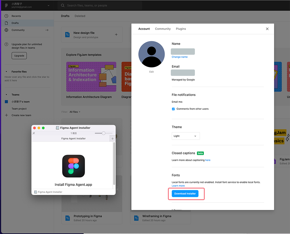 ダウンロードしたら、Figmaを再起動し、先ほどの設定画面を見て、下記のようになればOK。
