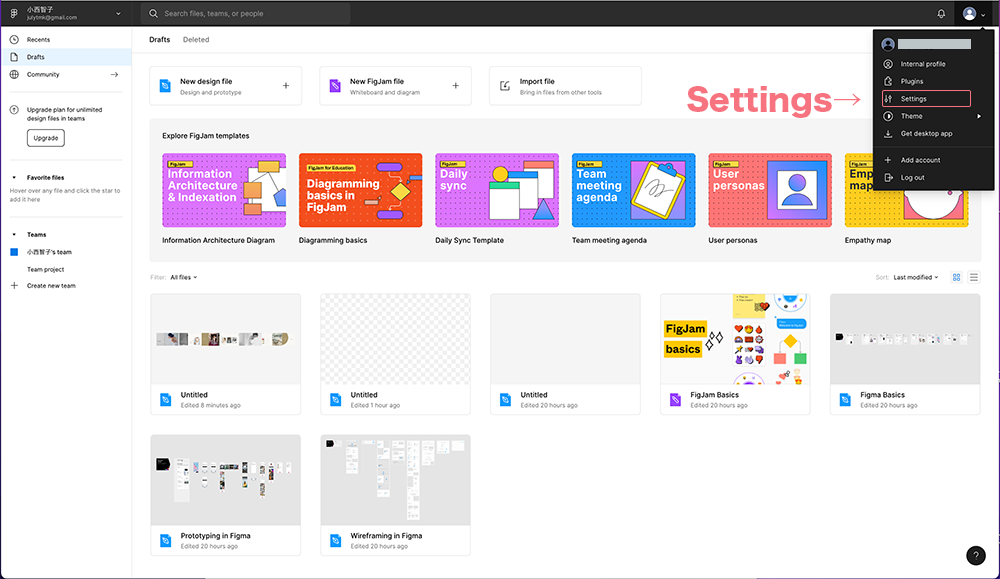 Figmaのダッシュボードの右上の人のアイコンをクリックして、「設定(settings)」をクリック。